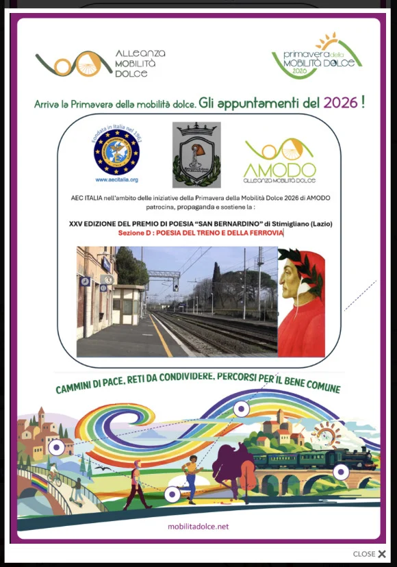 Annunciata la data della cerimonia di premiazione della XXV edizione del Premio di Poesia “San Bernardino” di Stimigliano (Rieti) nella verde Sabina. La premiazione di svolgerà il 24 maggio alle ore 1630 nella suggestiva Piazza Leone Orsini, nel cuore del borgo antico di Stimigliano, alla presenza delle autorità cittadine. Il premio prevede una sezione dedicata alla “Poesia del Treno e della Ferrovia”, che ha visto la partecipazione di autori capaci di raccontare il viaggio e il movimento attraverso versi evocativi ed è per questo che AEC patrocina ormai da circa un decennio questo Premio letterario. L’evento è promosso dall’Associazione Culturale “Casa Sabina della Poesia” ed è inserito nel programma della Primavera della Mobilità Dolce 2026.