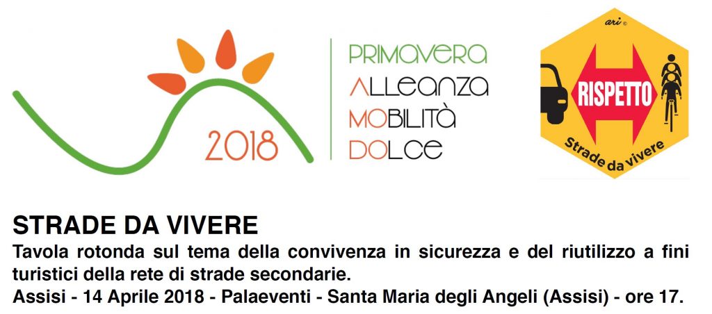 STRADE DA VIVERE. Tavola rotonda sul tema della convivenza in sicurezza e del riutilizzo a fini turistici della rete di strade secondarie. Assisi – 14 Aprile 2018 – Palaeventi – Santa Maria degli Angeli (Assisi) – ore 17. La Tavola rotonda è organizzata in occasione della Strasubasio 2018 che quest’anno inaugurerà la Primavera della Mobilità dolce promossa da A.Mo.Do…