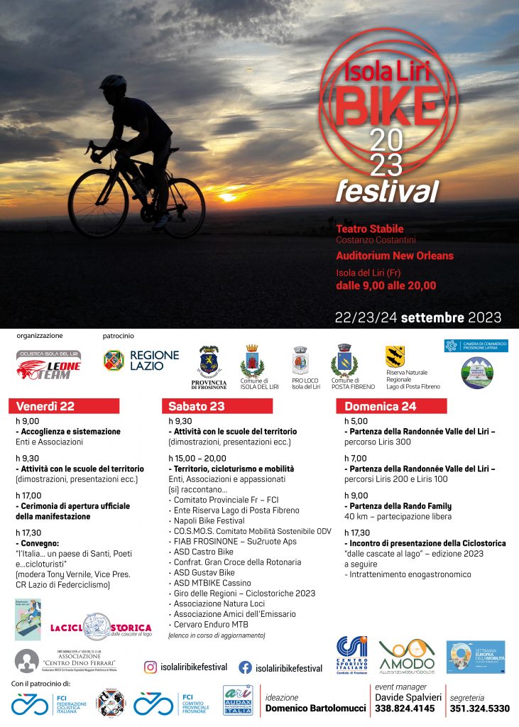 Avrà luogo nei giorni dal 22 al 24 settembre “Isola Liri Bike Festival 2023”. Per tutti i dettagli, consultare la locandina in evidenza.