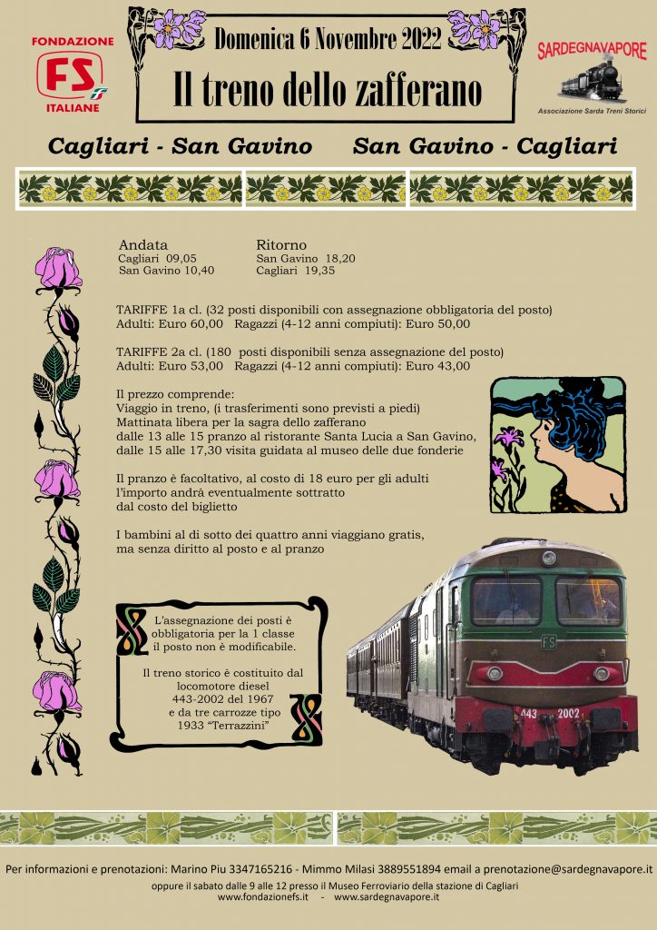 Treno dello zafferano: il 6 novembre viaggio con il treno storico da Cagliari a San Gavino in occasione della sagra dello zafferano. In attesa della locomotiva a vapore che si…