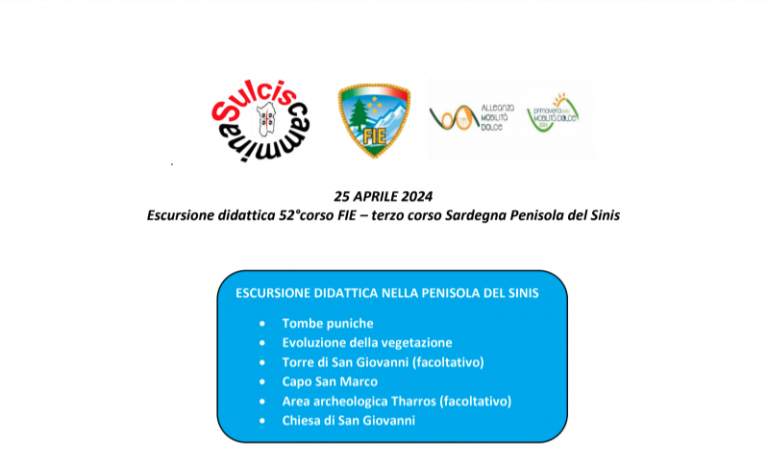 Il 25 aprile 2024 si svolgerà l’escursione didattica del 52° corso FIE – terzo corso Sardegna Penisola del Sinis. Ecco l’itinerario: ESCURSIONE DIDATTICA NELLA PENISOLA DEL SINIS  Tombe puniche…