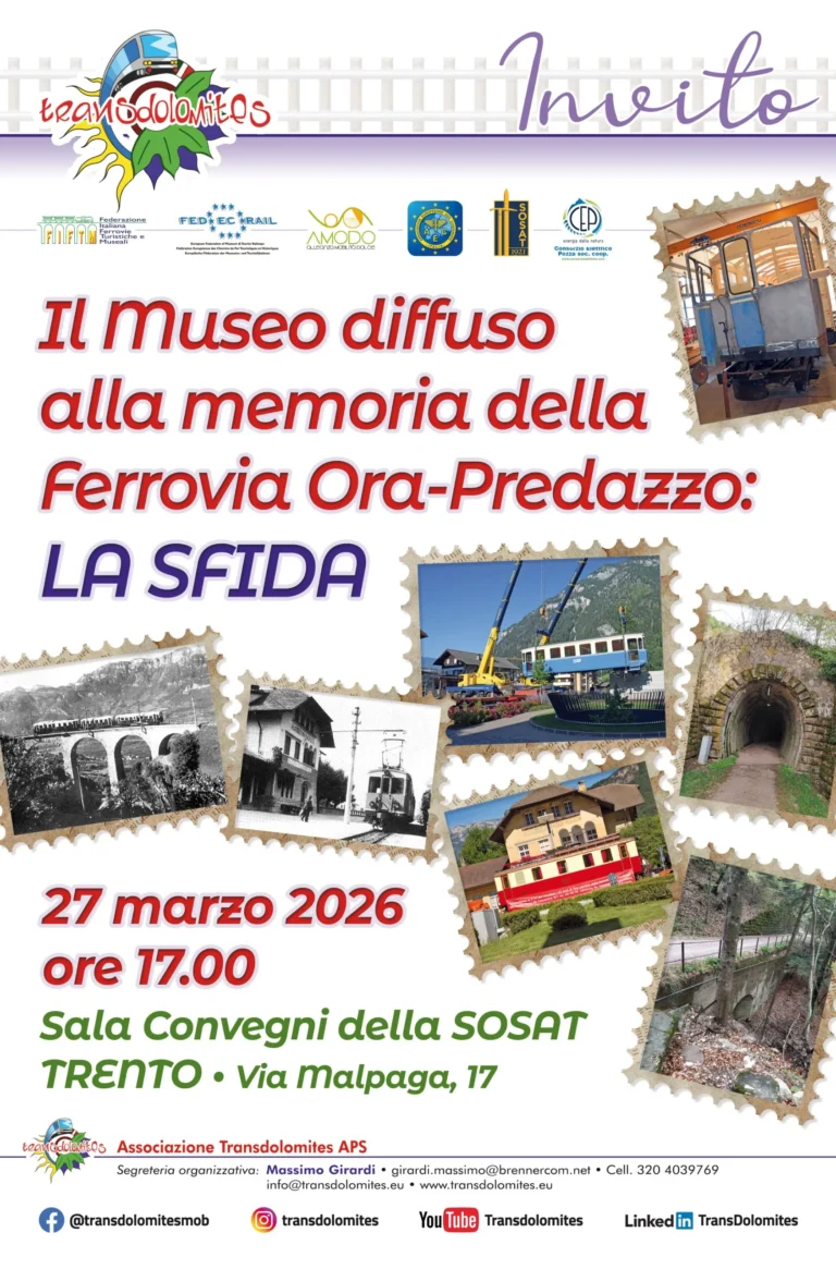 “Il Museo diffuso alla memoria della Ferrovia Ora-Predazzo: la sfida” 27 marzo, ore 17.00 Sala Convegni della SOSAT, Via Malpaga 17, TRENTO Programma Saluti istituzionali Massimo Girardi, presidente di Transdolomites.…