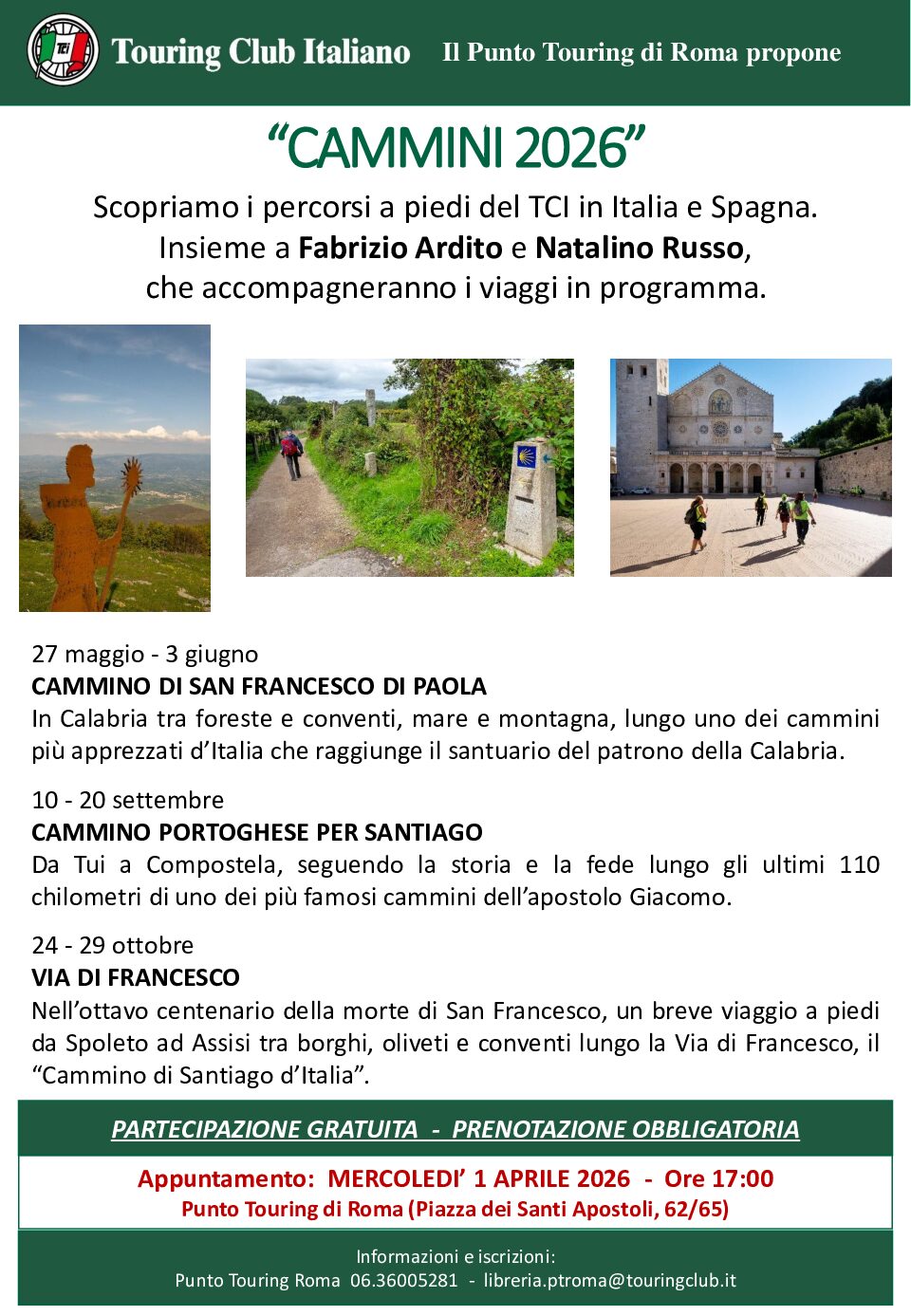 “CAMMINI 2026” Appuntamento: MERCOLEDI’ 1 APRILE 2026 – Ore 17:00 Punto Touring di Roma (Piazza dei Santi Apostoli, 62/65) Scopriamo i percorsi a piedi del TCI in Italia e Spagna.…