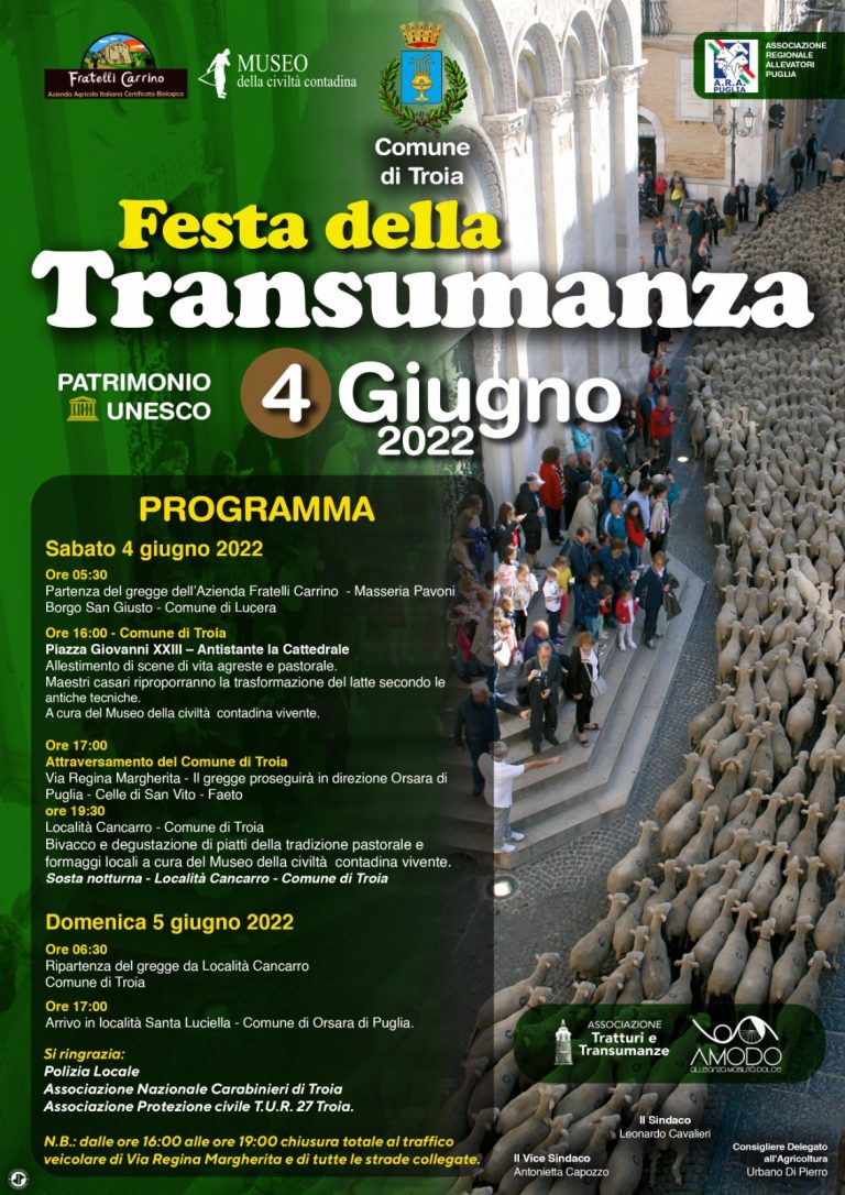 Un gregge di settecento pecore, razza gentile di Puglia, dell’Azienda Agricola Fratelli Carrino, nel pomeriggio di sabato prossimo, 4 giugno, attraverserà il Comune di Troia, diretto ai pascoli dei Monti…