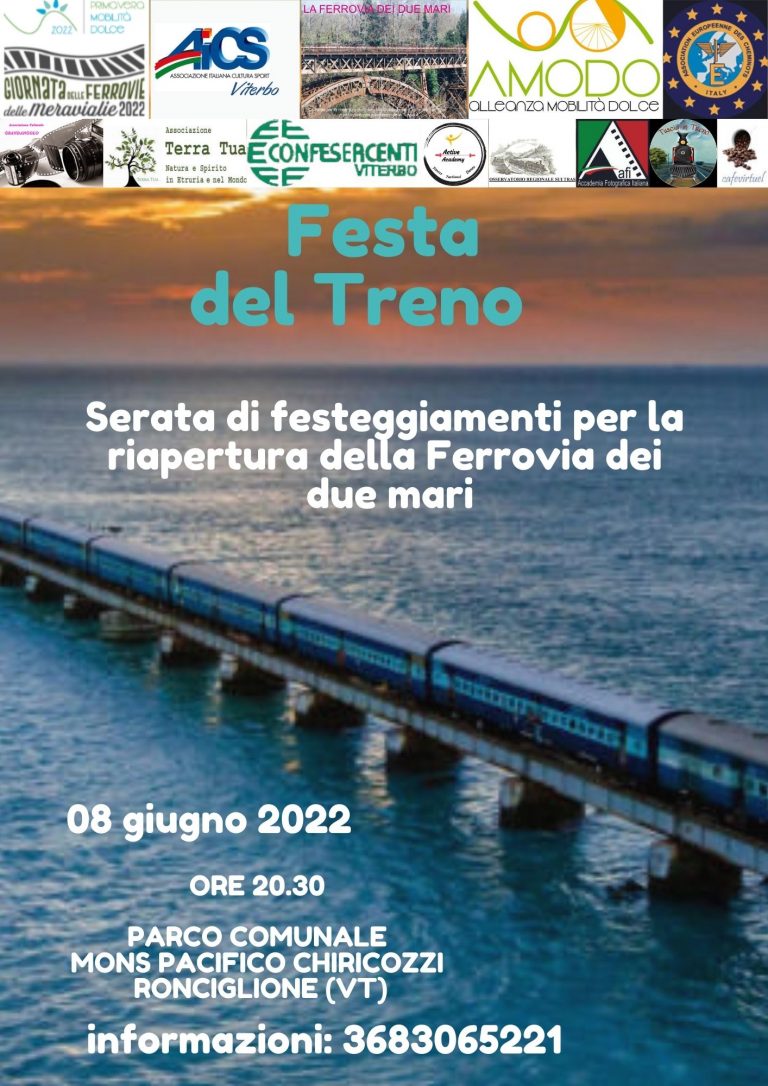 FESTA DEL TRENO 08 giugno 2022  SERATA DI FESTEGGIAMENTI PER LA RIAPERTURA DELLA FERROVIA DEI DUE MARI Il comitato per la riapertura della Civitavecchia Capranica Sutri Orte o Ferrovia dei…