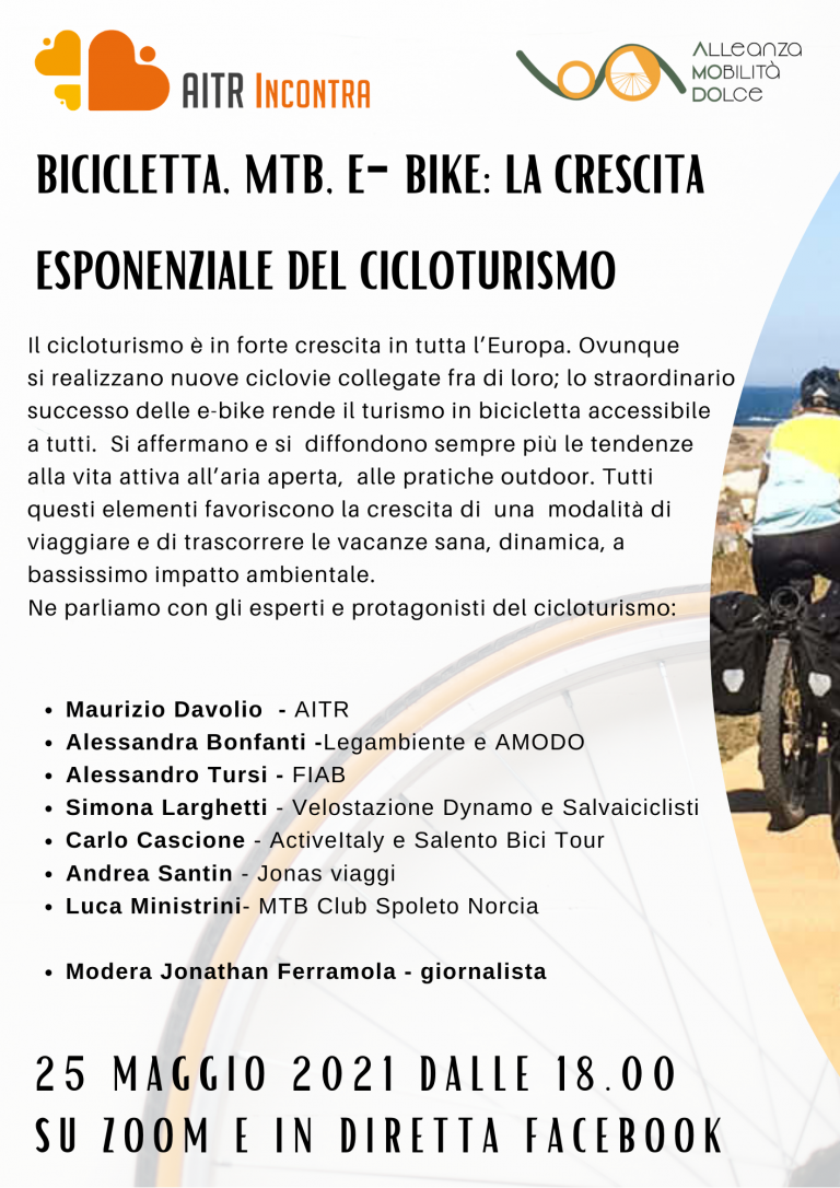 25 maggio webinar AITR – Bicicletta, MTB, E-bike: l’aumento esponenziale del cicloturismo