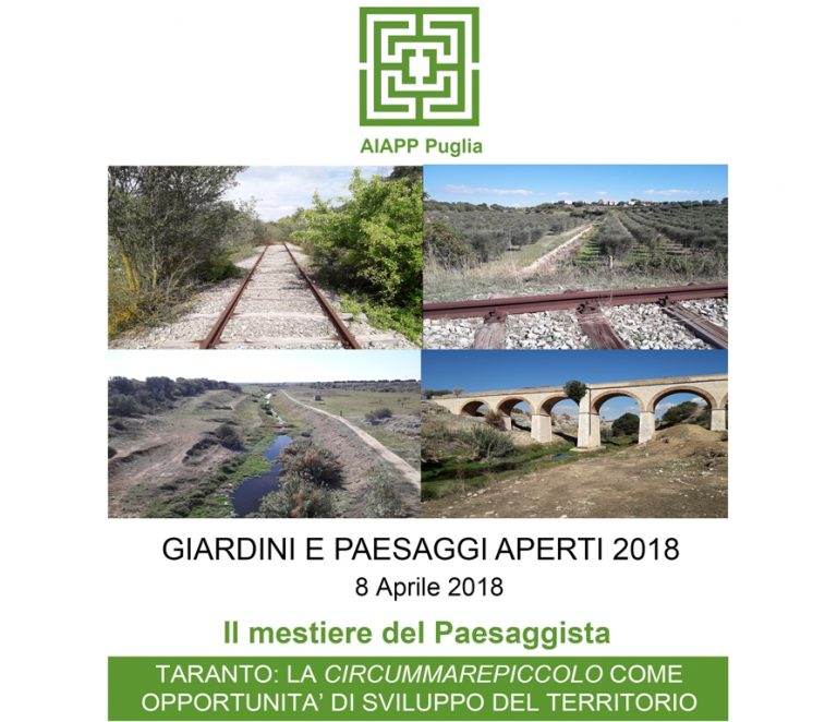 Nell’ambito dell’evento “Giardini e Paesaggi Aperti 2018“, la Sezione Puglia di AIAPP (membro dell’Alleanza) organizza una giornata per parlare e camminare sulla vecchia linea ferroviaria per Taranto Arsenale (detta “Circummarepiccolo”) chiusa 40…